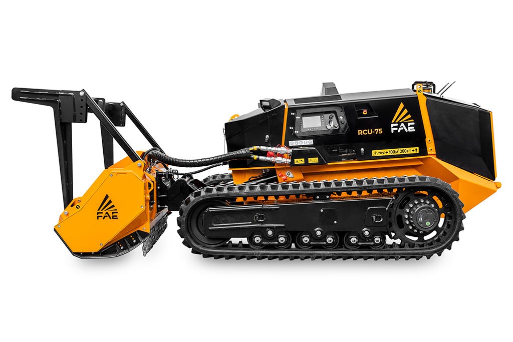 Le RCU75 est un automoteur sur chenilles compact et puissant de FAE capable de broyer les branches et le bois, l’herbe et les petits arbustes, de broyer les souches ou de fraiser l’asphalte grâce aux différents équipements FAE. Grâce à la plaque d’attache SAE, il peut également être associé à de nombreux équipements tiers pour chargeuse compacte. Il peut compter sur un moteur Rehlko (Kohler) de 74 ch. Le RCU75 est capable de travailler sur des pentes raides, jusqu’à 55°. Le chenillard renforcé est doté d’une voie variable hydraulique avec des demi-trains indépendants pour assurer le maximum de stabilité même sur des terrains escarpés. L’excellente adhérence est garantie par les chenilles en caoutchouc à profil haut ou en acier, associées au système à rouleaux multiples du chenillard. La double transmission hydrostatique permet de gérer au mieux aussi bien la traction que l’équipement